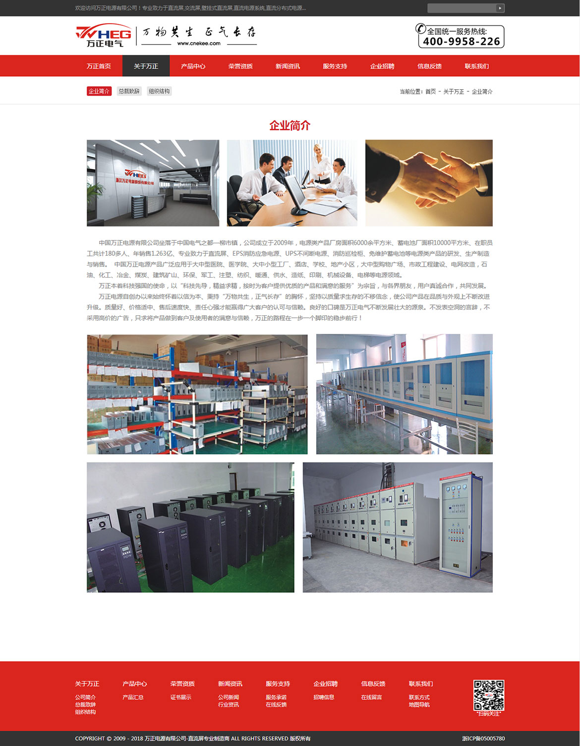 中國(guó)萬正電源有限公司坐落于中國(guó)電氣之都—柳市鎮(zhèn),公司成立于2009年,電源類產(chǎn)品廠房面積6000余平方米、蓄電池廠面積10000平方米、在職員工共計(jì)180多人、年銷售1.263億、專業(yè)致力于直流屏、EPS消防應(yīng)急電源、UPS不間斷電源、消防巡檢柜、免維護(hù)蓄電池等電源類產(chǎn)品的研發(fā)、生產(chǎn)制造與銷售。 中國(guó)萬正電源產(chǎn)品廣泛應(yīng)用于大中型醫(yī)院、醫(yī)學(xué)院、大中小型工廠、酒店、學(xué)校、地產(chǎn)小區(qū),大中型購物廣場(chǎng)、市政工程建設(shè)、電網(wǎng)改造,石油、化工、冶金、煤炭、建筑礦山、環(huán)保、軍工、注塑、紡織、暖通、供水、造紙、印刷、機(jī)械設(shè)備、電梯等電源領(lǐng)域。
